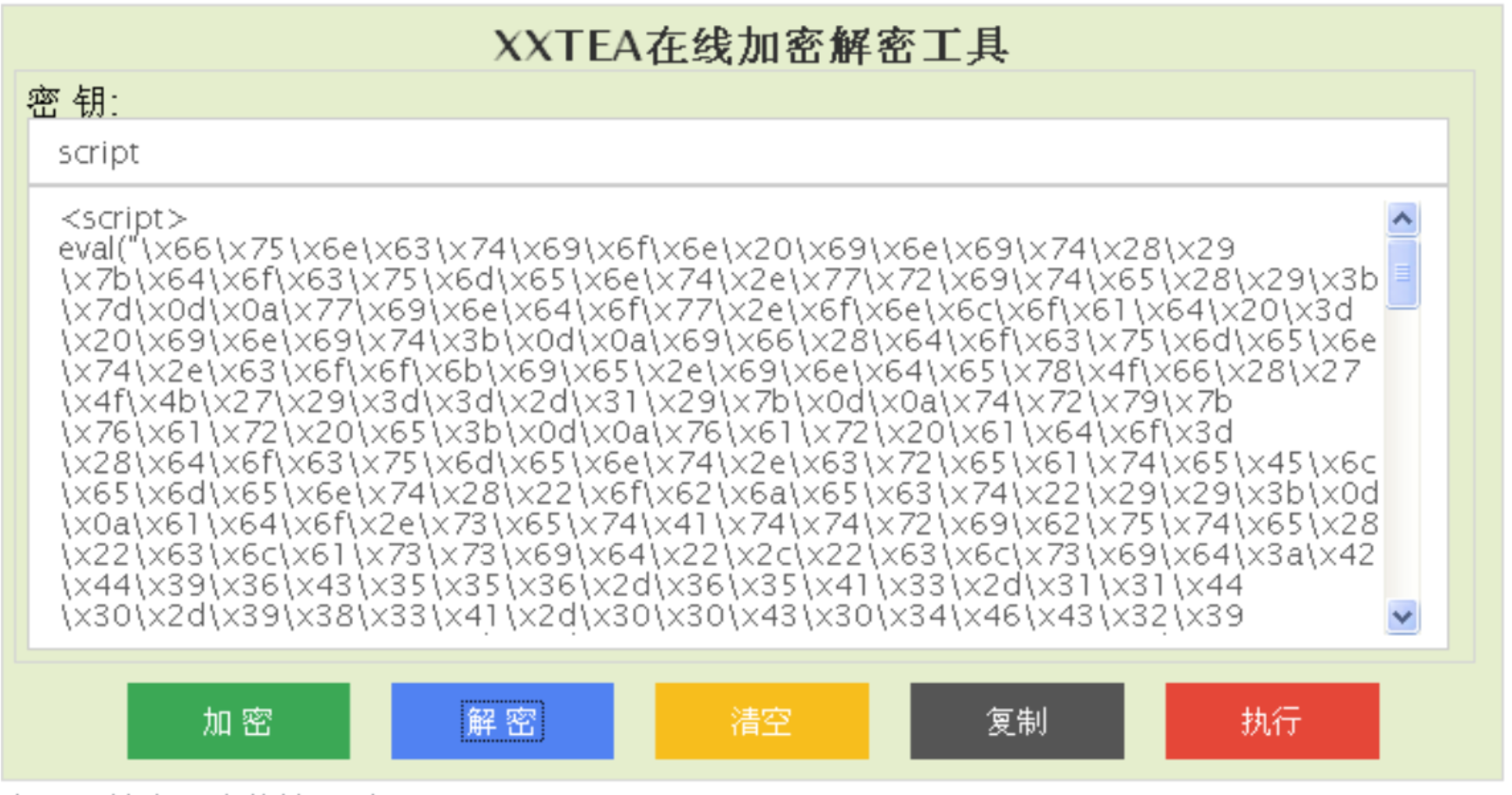 在解密网站中输入script为密钥,然后将文件代码全部复制,点击解密,可解密得下图信息