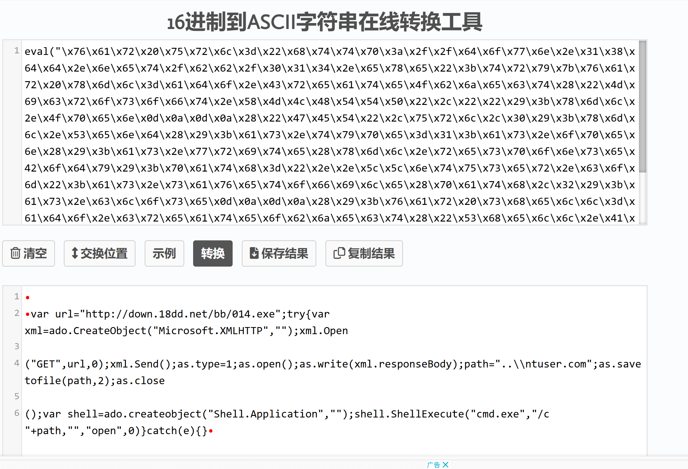 依次打开这四个文件,打开第一个文件5d7e9058a857aa2abee820d5473c5fa4发现是十六进制数据,解密后信息如下,这个文件前面部分下载了一个http://down.18dd.net/bb/014.exe的可执行文件,后面部分是对ADODB漏洞的继续利用。