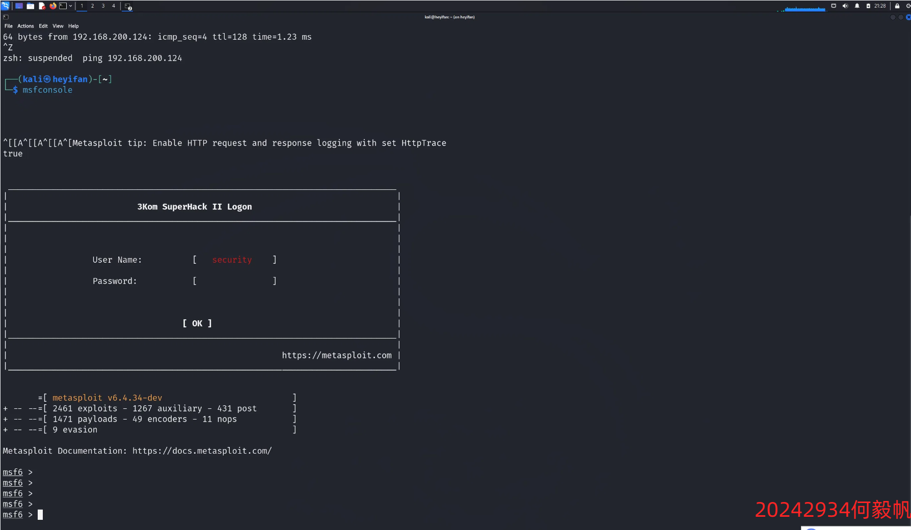在Kali虚拟机中使用msfconsole命令令打开metasploit工具: