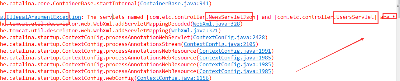细看是非法参数异常,映射错误(一个servlet不能有相同的映射名)。