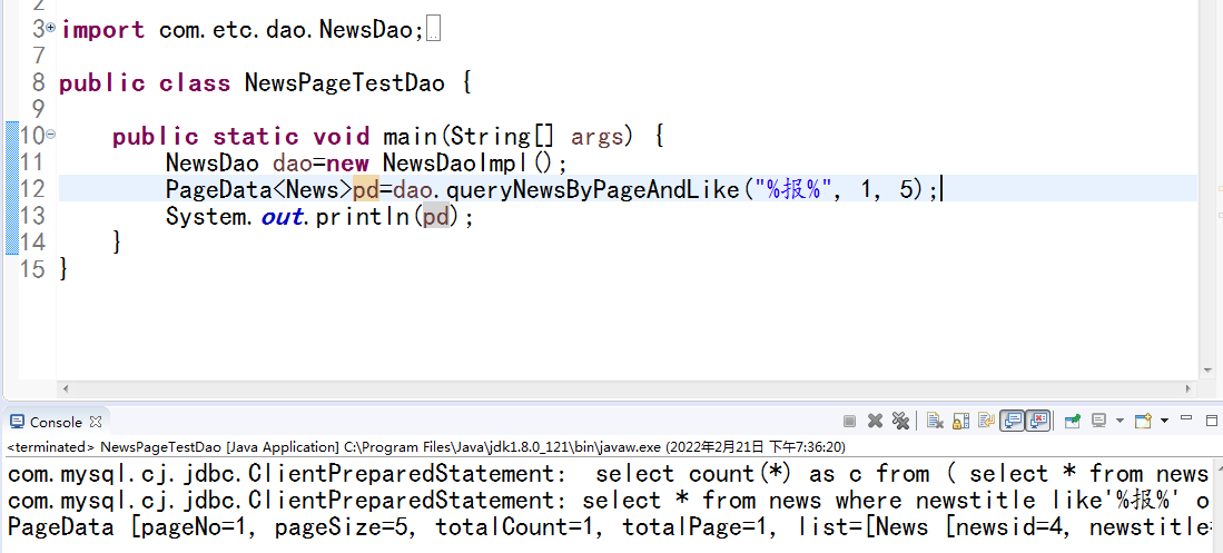 PageData<News>pd=DBUtil.exQueryByPage(sql, News.class, pageNo, pageSize, keywords,keywords);