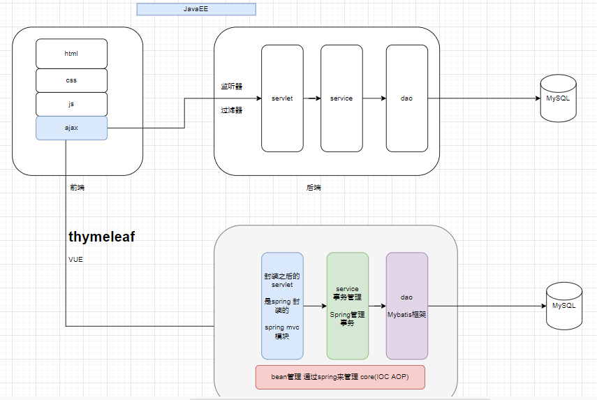 没学Spring之前,我们做web项目是通过ajax和后端控制层的servlet交互,servlet调用service方法,service调用dao方法,dao通过JDBC连接到Mysql数据库。学了Spring后,servlet的代码被Spring封装,成为SpringMVC模块;service事务管理被Spring事务管理取代;dao层写的sql代码被Mybatis框架所代替。
