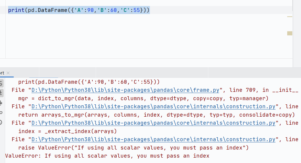 - 由字典创建时,默认key是columns,但是字典的value不可以是非标量值