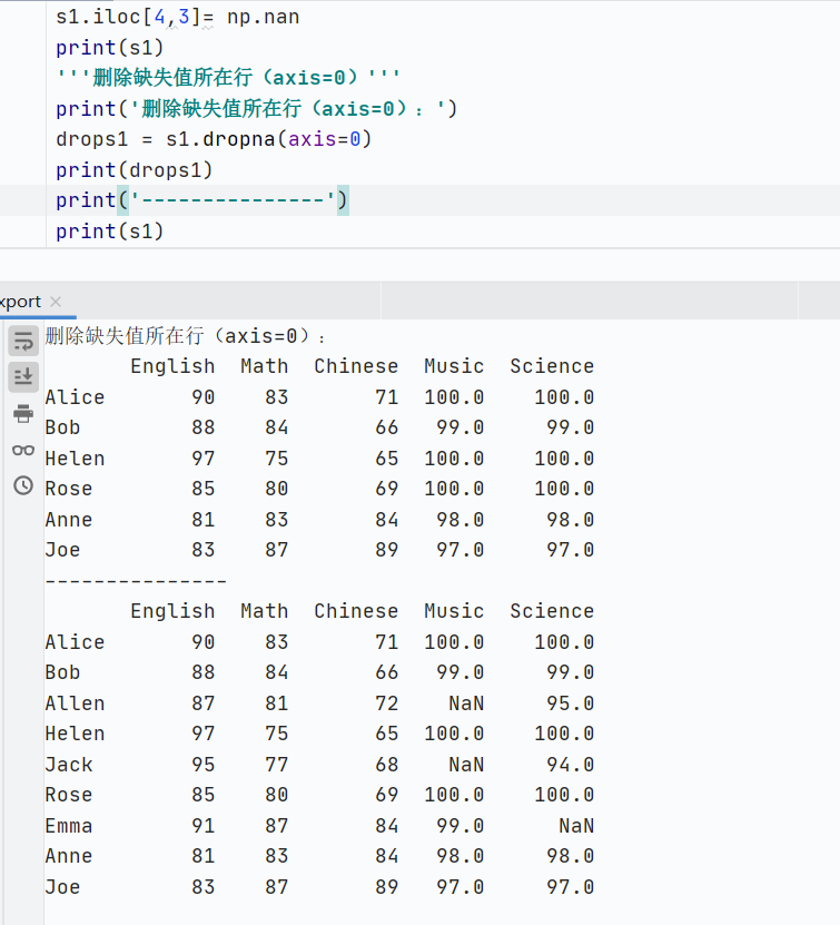 - dropna():删除含有缺失值的行(axis=0)返回修改后的DataFrame