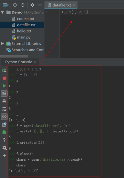 注意: 1,2,3存入使用了format方法,list存入使用了str转换为字符串再存入。存入文件后,数据类型都变成了字符型,如果想还原还需要分割逐个还原。