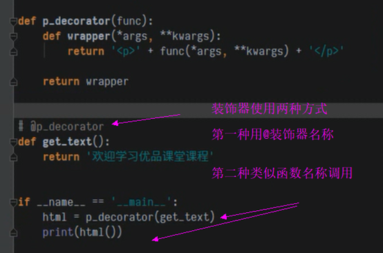 装饰器本身返回内部函数对象(因为没有括号,所以不是内部函数执行结果),函数p_decorator()返回的是函数的对象wrapper不是wrapper的结果