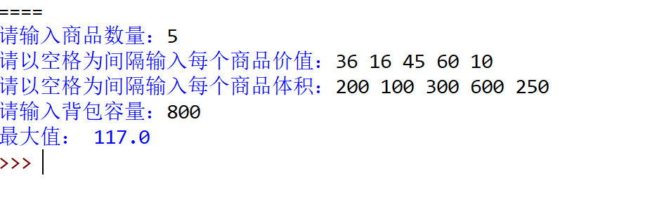 1 n=int(input('请输入商品数量:')) 2 p=input('请以空格为间隔输入每个商品价值:') 3 v=input('请以空格为间隔输入每个商品体积:') 4 c=int(input('请输入背包容量:')) 5 6 Ratio = [] 7 P = [int(i) for i in p.split( )] 8 V = [int(i) for i in v.split( )] 9 for m in range(n): 10 t=P[m]/V[m] 11 Ratio.append(t) 12 13 Ratio.sort(reverse=True) 14 15 ans = 0 16 i = 0 17 while c>0 and i<n: 18 if V[i]<=c: 19 ans = ans+P[i] 20 c = c-V[i] 21 else: 22 ans = ans+c*Ratio[i] 23 c = 0 24 i = i+1 25 print('最大值:',ans)