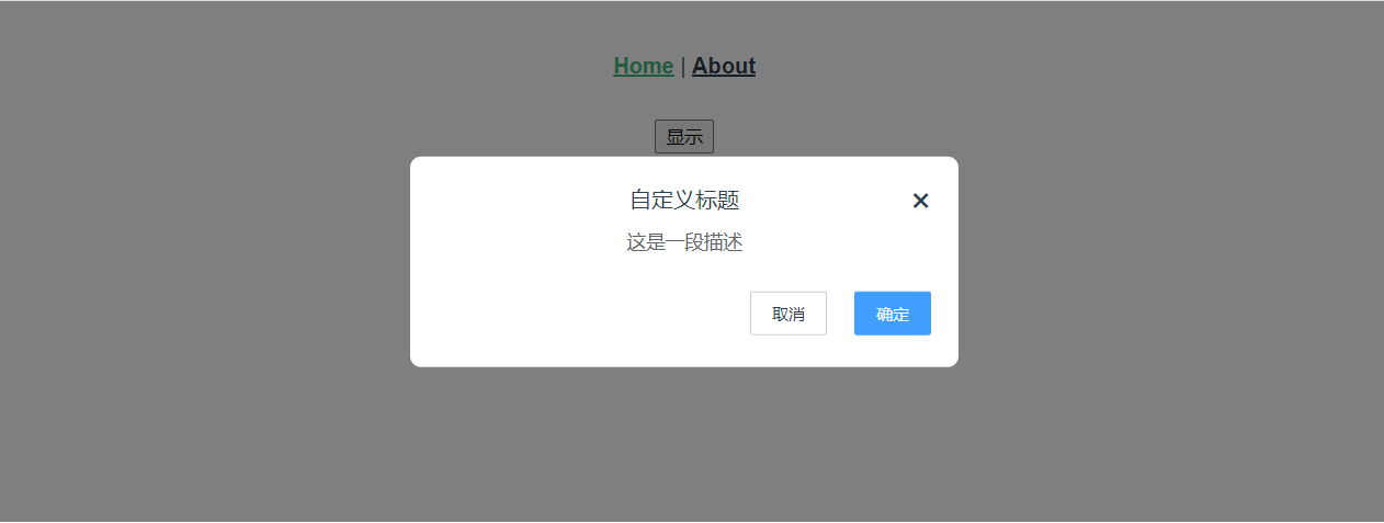 还要注意一点的是当我们点击遮罩的时候,弹窗隐藏,点击白色盒子部分,弹窗还是显示,如上代码在子组件最外一层元素身上绑定一个点击事件`handleClose`,将弹窗的心事隐藏的初始值设置为false,通过子传父触发传递,在子元素`.container`身上阻止事件冒泡`@click.stop`
