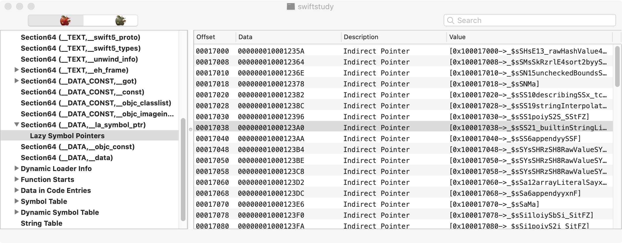 可以看出来上面的函数地址和我们平时自己写的函数地址不是存在同一个区域的,我们平时都是在 __TEXT 区,他是存在 __DATA 区域的,也就是全局区,是允许我们在程序运行过程中动态修改的,当我们绑定完一次 dyld_stub_binder 后,程序会帮我们把这块内存修改了能够真正调用的地址了
