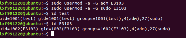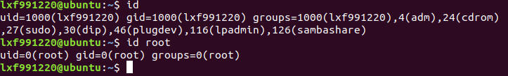 id命令可以显示真实有效的用户ID(UID)和组ID(GID)UID 是对一个用户的单一身份标识。组ID(GID)则对应多个UID。用户lxf991220的uid=1000;gid=1000;用户lxf991220是组adm、cdrom、sudo、dip、plugdev、lpadmin、sambashare的成员。root用户的uid=0;gid=0