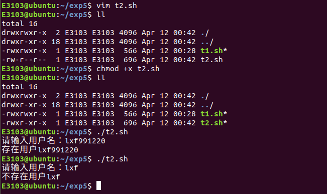 编写一脚本,判断输入用户名是否存在,输出结果只能是存在该用户或者不存在该用户,不能有其