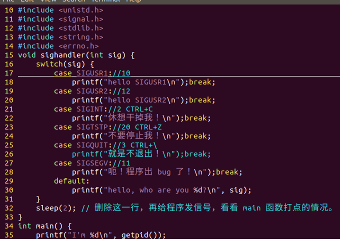输入完上述代码,编译并运行,然后再给该进程发送信号,观察进程对接收到信号的反应: