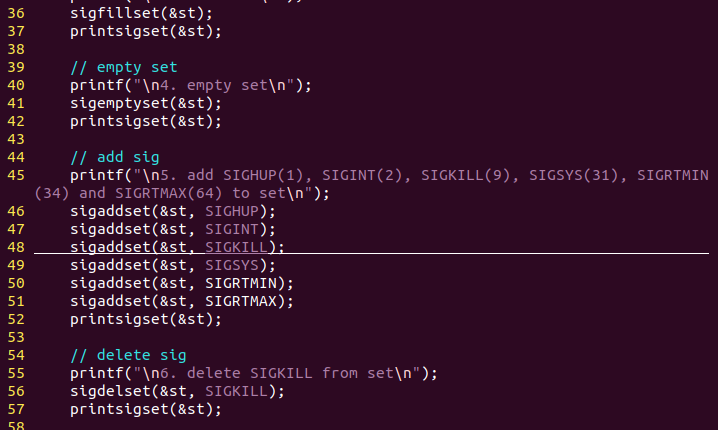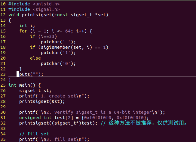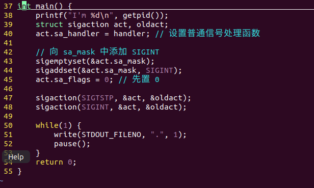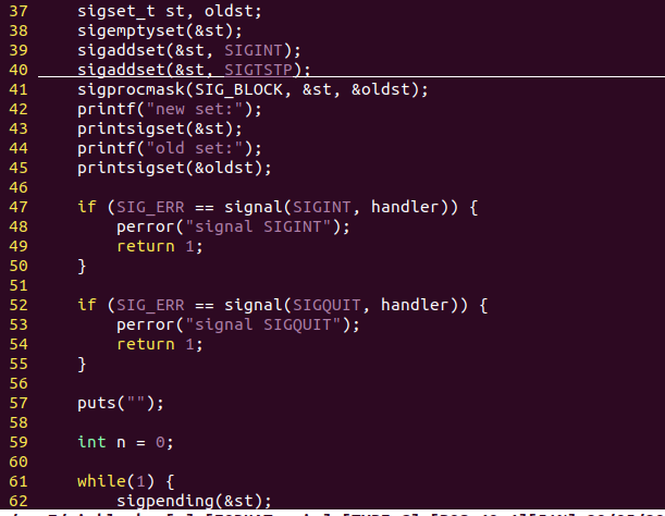 下面给出一个程序来说明 sigaction() 函数的使用,程序注册了信号 SIGINT 和 SIGTSTP . 需要注意的一点是 sa_mask 被设置为 SIGINT ,它表示当执行信号处理函数的时候,阻塞信 SIGINT 信号。在handler 函数加入了一打印未决信号的功能,以验证执行到 handler 的时候发送 SIGINT 是被阻塞住的。