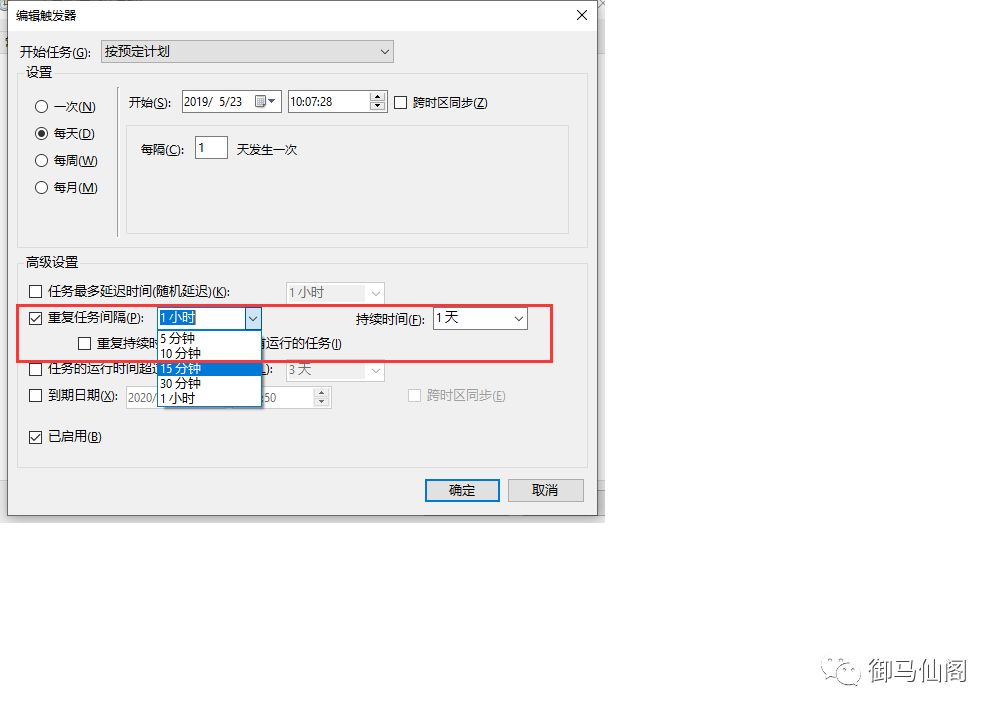 选中 重复任务时间间隔 。在这里我们可以设置定时任务的运行时间间隔,最小是5分钟。点击确定所有的任务就完成了。