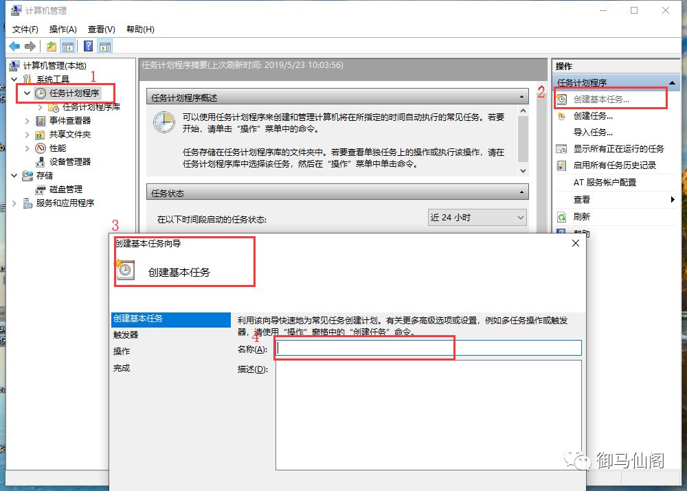 按上图 1,2操作完后会弹出3窗口,在3窗口的4里边输入定时任务的名称,然后点击3窗口中的下一步,按照需要设置参数。直到下图这里