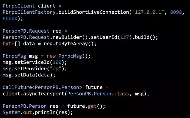 client 端代码实现如下。首先构造 PbrpcClient,然后构造 PersonPB.Request,也就是请求,设置好 user_id,构造 PbrpcMsg 作为 TCP 层传输的数据 payload,这就是协议结构中的 body 部分。