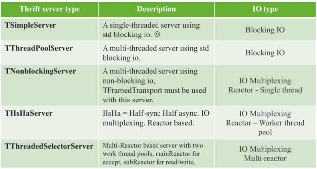 说个具体的例子,Thrift 作为一个融合了 序列化 +RPC 的框架,提供了很多种 Server 的构建选项,从名称中就可以看出他们使用哪种 I/O 和线程模型。