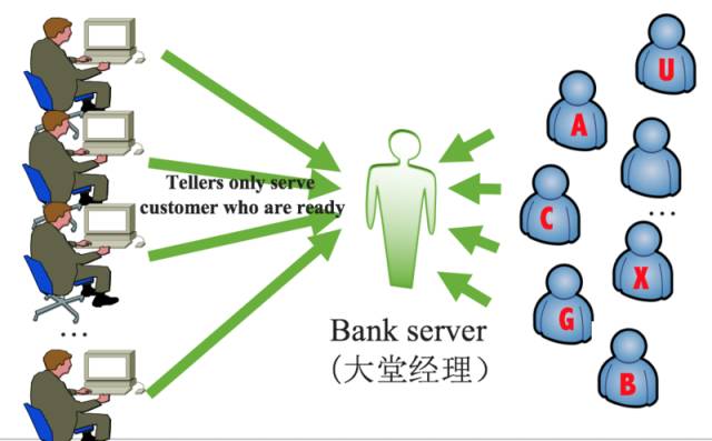 下图是 I/O 多路复用,存在一个大堂经理,相当于代理,它来负责所有的客户,只有当客户写好单据后,才把客户分配一个柜员处理,可以想象柜员不用阻塞在 I/O 读写上,这样柜员效率会非常高,这也就是 I/O 多路复用的精髓。