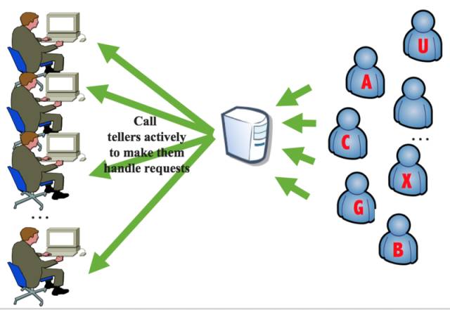 下图是 异步 I/O,完全不存在大堂经理,银行有一个天然的“高级的分配机器”,柜员注册自己负责的业务类型,例如 I/O 可读,那么由这个“高级的机器”负责 I/O 读,当可读时候,通过 回调机制,把客户已经填写完毕的单据主动交给柜员,回调其函数完成操作。