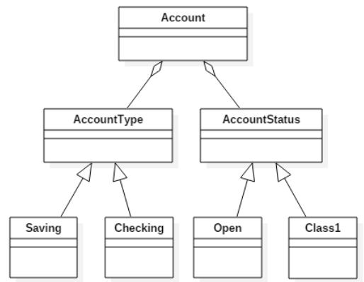 这是一个银行账户的例子,一个Account包含两个部分,AccountType和AccountStatus,这两个类都是抽象类,这两个类分别有两个具体的子类,Account在使用的是抽象类而不是子类,从而在Account的角度上是符合依赖倒置原则的。