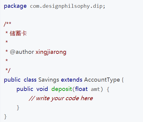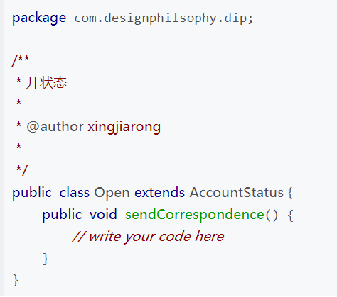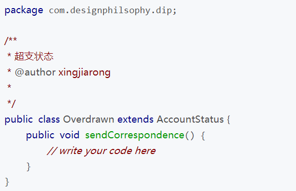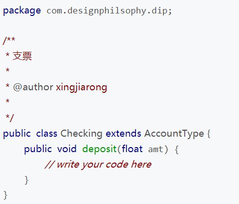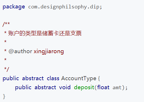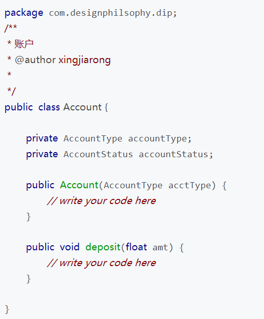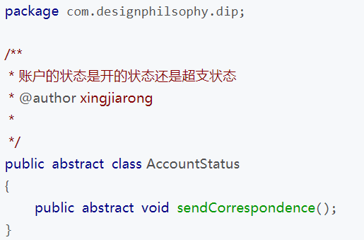 在这个例子中,Account类依赖于AccountType和AccountStatus,但是这两个类都是抽象类,如果我们想再添加一个新的状态超支状态的话,不会对其他的类造成影响。