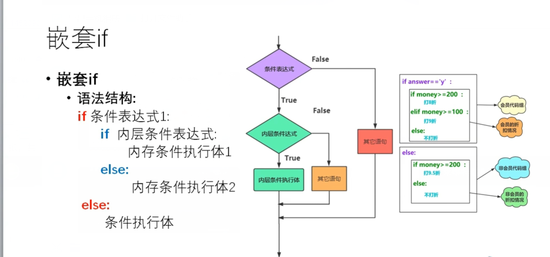 #嵌套if的使用 money=float(input('请输入消费金额')) answer=input('是否有会员卡') if answer=='y' or 'yes' or '有': if money>=200: print('消费:',money*0.8) elif 100<=money<200: print('消费:',money*0.9) else: print('不打折:',money) else: if money>=100: print('消费:',money*0.95) else: print('消费:',money)