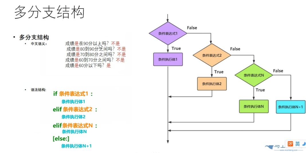 #多分支结构 score=int(input('请输入学生成绩')) if 90<=score<=100: print('成绩为:a') elif 70<=score<=89: print('成绩为:b') elif 60<=score<=69: print('成绩为c') elif 0<=score<=59: print('不及格') else: