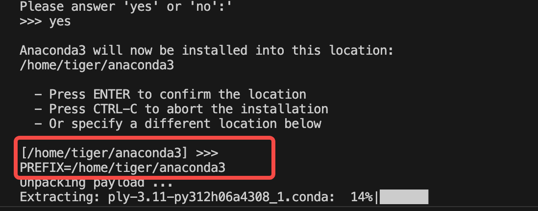 安装过程中会需要不断回车来阅读并同意license。安装路径默认为用户目录(可以自己指定),最后需要确认将路径加入用户的.bashrc中。