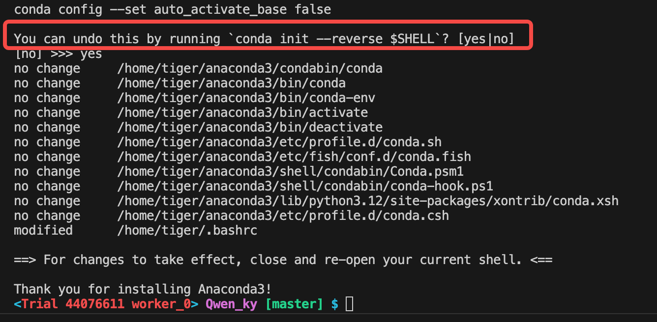 按 Enter 键查看许可协议,最后输入 yes,然后按 Enter 接受默认安装位置 /home/<USER>/anaconda3 ; 最后还有个询问是否自动写入环境变量,可以回复yes。可以通过命令"conda --version" 检查环境变量是否已OK