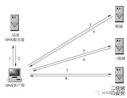 当局部DNS服务器自己不能回答客户机的DNS查询时,它就需要向其他DNS服务器进行查询。此时有两种方式,如图所示的是递归方式。局部DNS服务器自己负责向其他DNS服务器进行查询,一般是先向该域名的根域服务器查询,再由根域名服务器一级级向下查询。最后得到的查询结果返回给局部DNS服务器,再由局部DNS服务器返回给客户端。