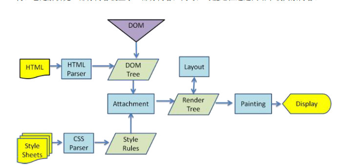 在浏览器没有完整接受全部HTML文档时,它就已经开始显示这个页面了,浏览器是如何把页面呈现在屏幕上的呢?不同浏览器可能解析的过程不太一样,这里我们只介绍webkit的渲染过程,下图对应的就是WebKit渲染的过程,这个过程包括: