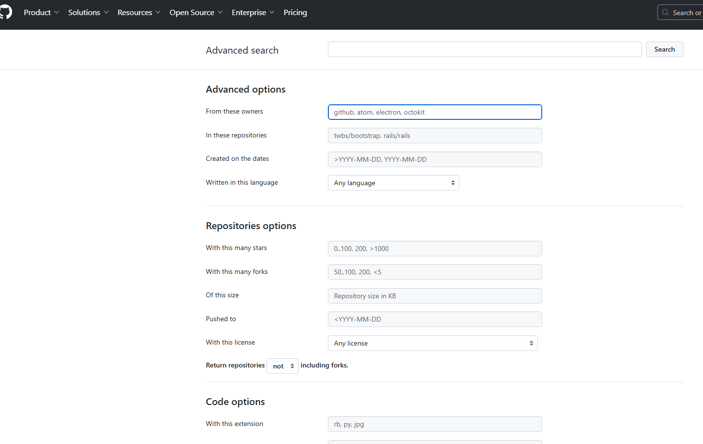 - 打开高级搜索页面:访问上述链接,即可进入 GitHub 的高级搜索页面。