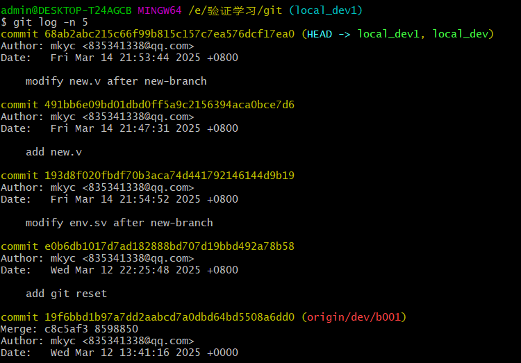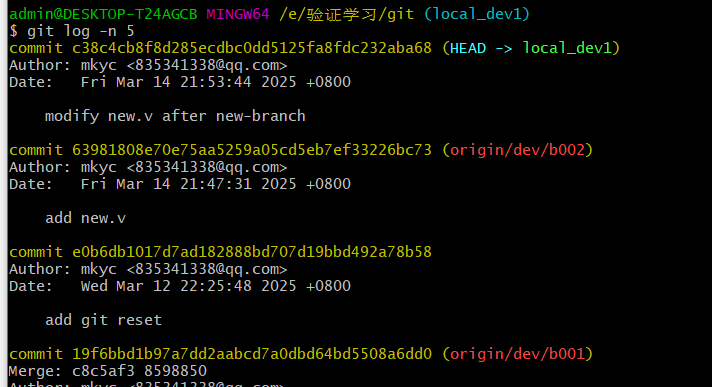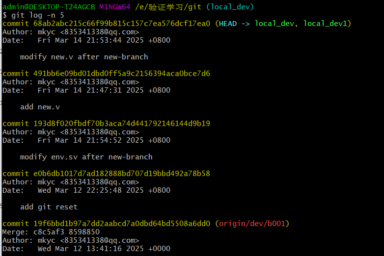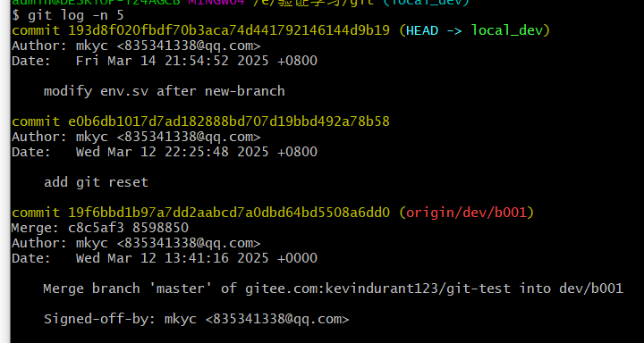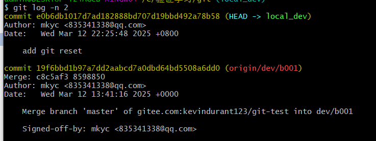 - 第一步,查看本地分支local_dev的近两次提交记录: