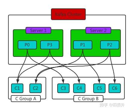 假设 Topic 的分区数量为 P,而消费者组中的消费者数为 C。那么,如果 P \< C , 就会出现消费者空闲的情况;如果 P > C,则会出现一个消费者被分配多个分区的情况,如下图。