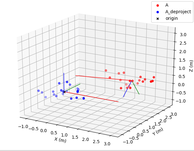 对点云乘以*U*的逆矩阵,$Q_A^{deproject}=Q_A U^T$,就实现了将PCA的三个轴和笛卡尔空间的XYZ轴对齐。下图中蓝色点云就是红色点云反投影后将质心移动到原点的点云。