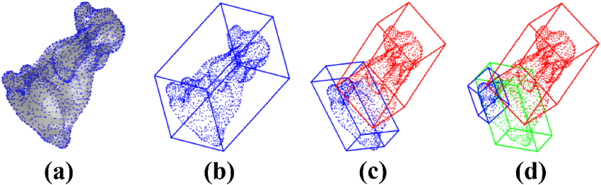 分布寻找反投影的点云在XYZ三个方向的最大值,就可以画出点云的Bounding box,再将bounding box投影回原来的点云就得到了点云的 Axis aligned bounding box (AABB),可以实现下面图([图片来源](https://www.researchgate.net/figure/a-A-complete-point-cloud-of-a-dog-model-b-bounding-box-c-two-child-boxes-resulted-from_fig3_356401567))中这样的包围盒。