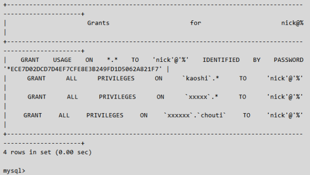 show grants for 'nick'@'%';