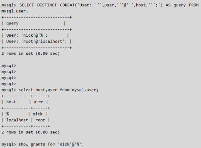 SELECT DISTINCT CONCAT('User: ''',user,'''@''',host,''';') AS query FROM mysql.user;