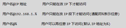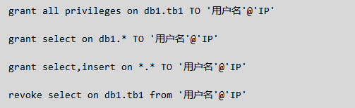 grant 权限 on 数据库.表 to '用户'@'IP地址'