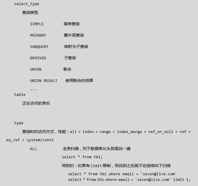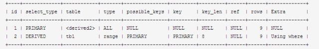 如:mysql> explain select * from (select nid,name from tb1 where nid < 10) as B;