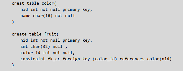 constraint 外键名 foreign key (从表字段’自己‘) references 主表(主键字段) # 外键