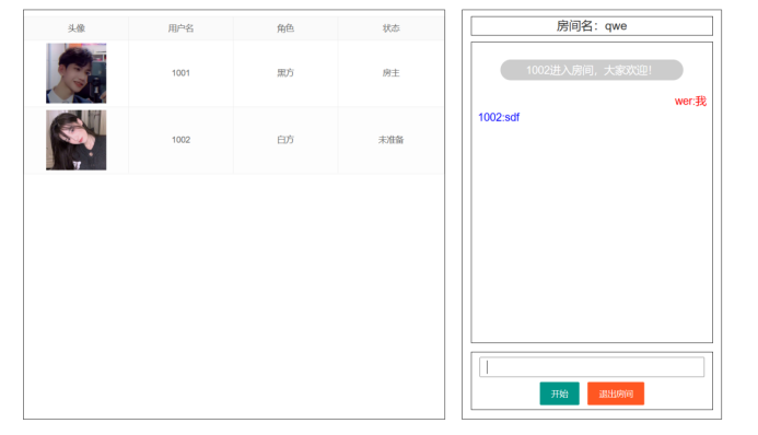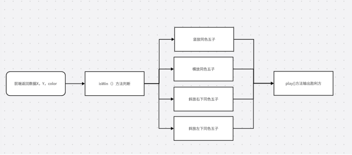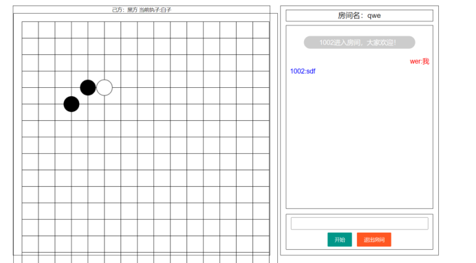 使用js在原有的房间页面里 进行跳转,当玩家点击开始按钮触发事件进行游戏,在房间页面中 加入棋盘,黑方者率先进行下棋,棋盘格局的落子作为X,Y值反馈给js,利用数组array[X][Y]进行for循环判断,四种情况下获得胜利,分为五子竖放,五子横放,五子斜左下,右下进行for循环判断,for循环判断落子的连续,用if语句判断color是否一致,方法返回true,输出黑方或白方获胜