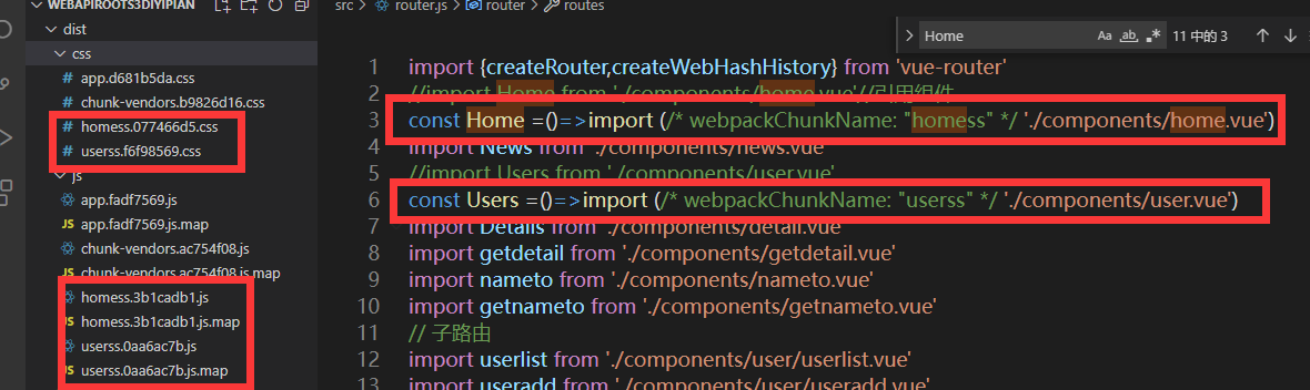 2:/* webpackChunkName: "homess" */ 就是打包过后的对于的静态路由的名称,可以自定义