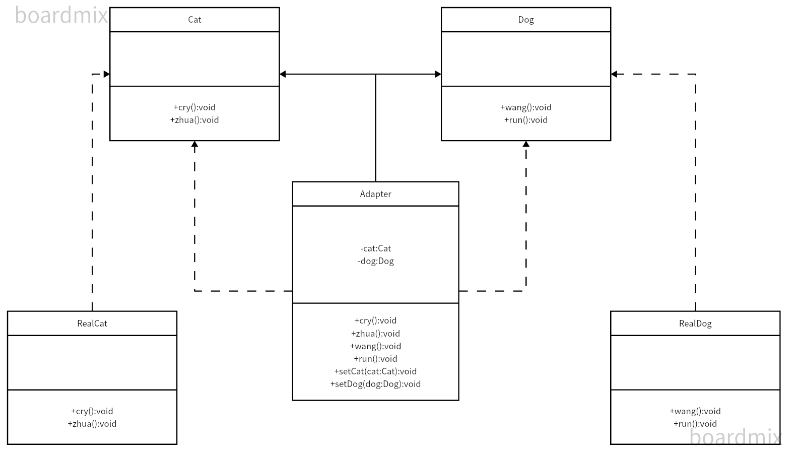 实现一个双向适配器,使得猫可以学狗叫,狗可以学猫抓老鼠。