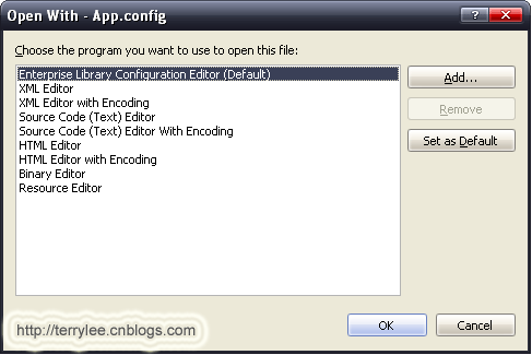 在Enterprise Library 3.0之前的两个版本,配置工具都是作为一个单独的应用程序,我也曾经介绍过一款把Enterprise Library配置工具集成到VS中的插件(Enterprise Library 2.0 插件介绍:Avanade Integration Pack)。这次发布的Enterprise Library 3.0直接把配置工具集成在了VS.NET中,可以非常方便的进行应用程序块的配置。安装后,配置文件默认的打开方式就是Enterprise Library Configuration Editor(如图1)。