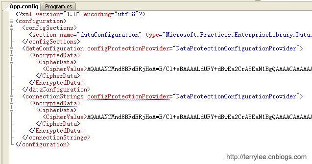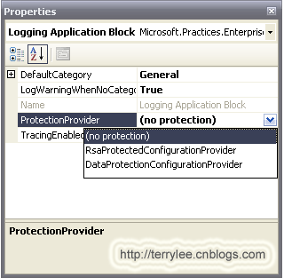 Enterprise Library 3.0还有一个最大的特色在于对配置区数据的加密,通过一个简单的属性配置就可以对任何一个应用程序块的配置区进行加密,如图4所示: