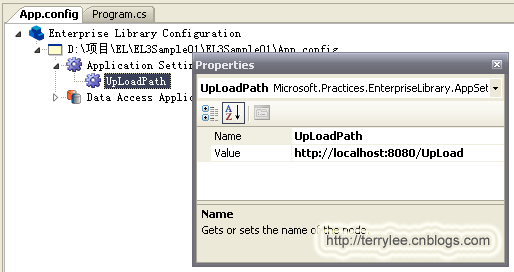 在Enterprise Library 3.0中,通过配置工具,我们可以创建和修改标准的AppSetting,在之前的版本中,我们对于自定义的AppSetting都需要手工到配置文件中去修改,现在可以通过可视化的配置工具进行管理AppSetting了,如图6所示,我们新建一个UpLoadPath: