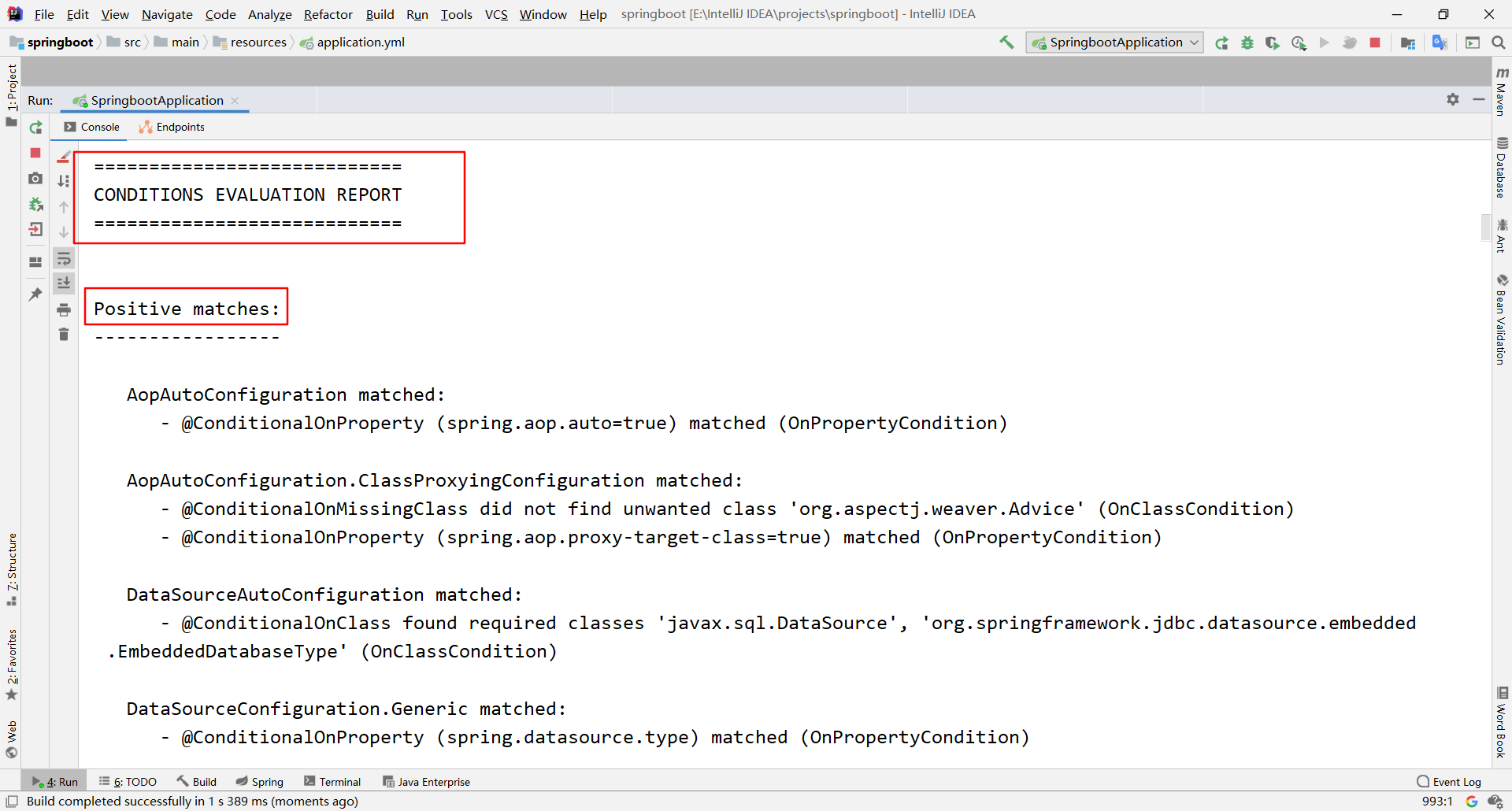 在springBoot的配置文件application.properties中配置debug=true可以查看哪些自动配置类生效,哪些不生效。
