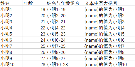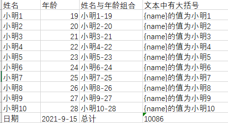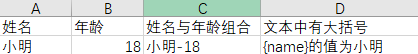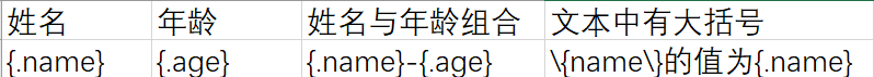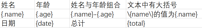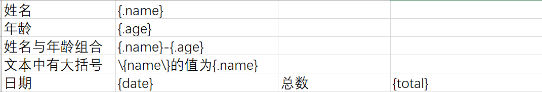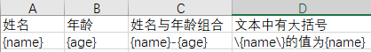 Excel表格中用{} 来包裹要填充的变量,如果单元格文本中本来就有{、}左右大括号,需要在括号前面使用斜杠转义\{、\}。